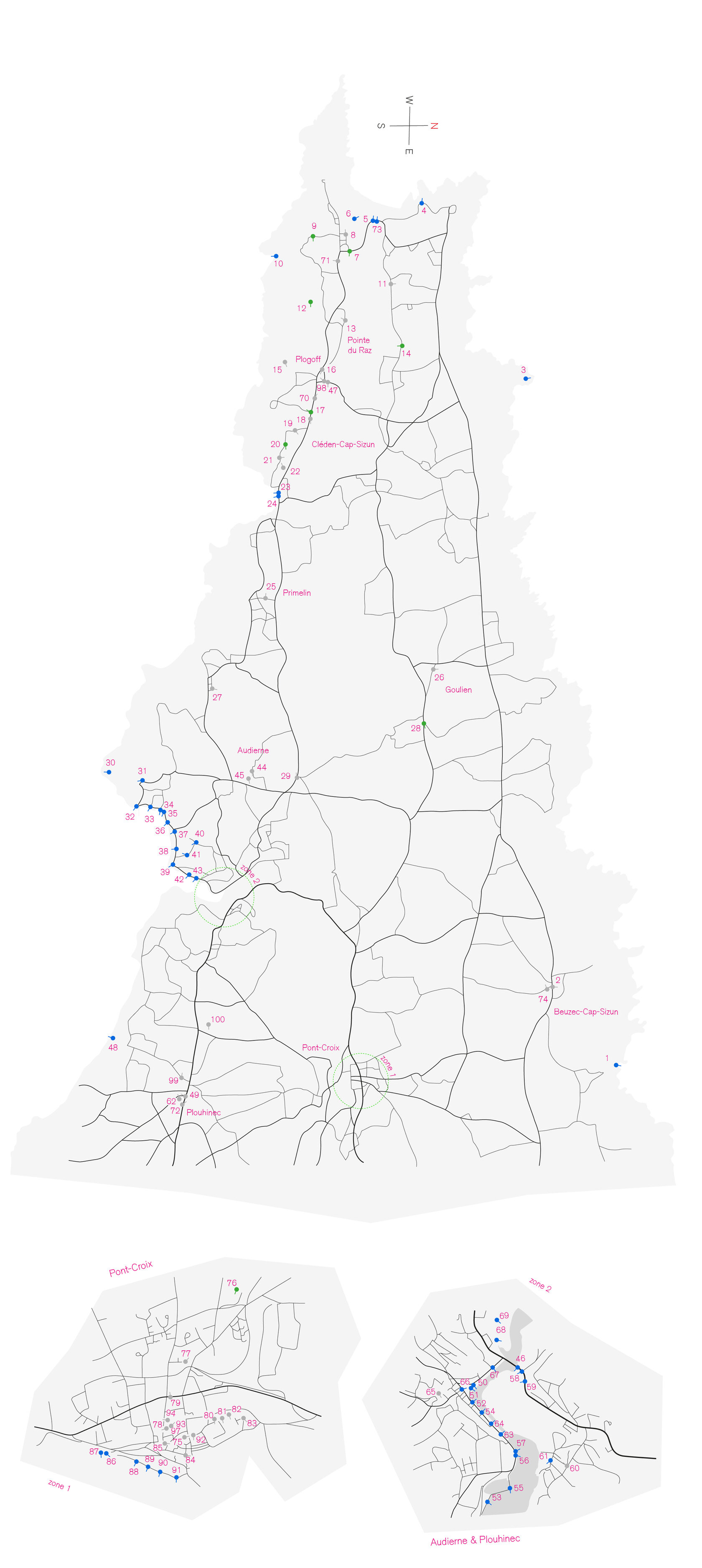 Voici, vous voyez la carte du Cap-Sizun sur laquelle il y a 100 points correspondant chacun à la position réelle du banc.